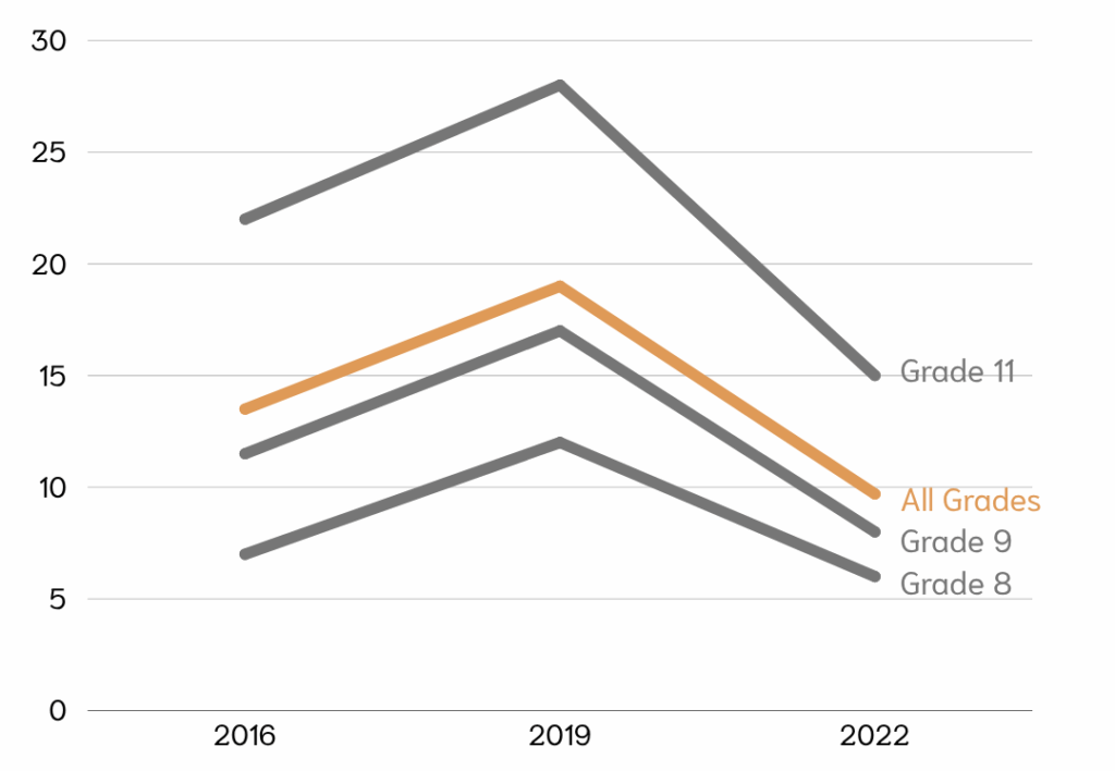 Tobacco/nicotine is one of the three most commonly used substances amongst Minnesota youth. On the upside, overall tobacco consumption has been decreasing over the past 10 years. In 2016, 13.5% of 8th, 9th, and 11th graders reported using tobacco in the last month. That decreased to 9.7% in 2022. However, that has been replaced by an immense increase in the number of students vaping cannabis.